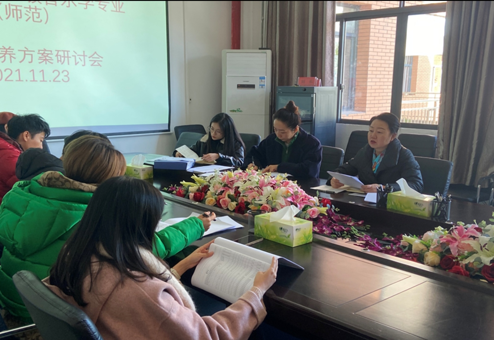 曾果果主持会议内容,针对培养方案中具体的课程设置向参会老师征求意见,就课程的合理性、必要性,教材的选择、研习见习的调整作出讨论。