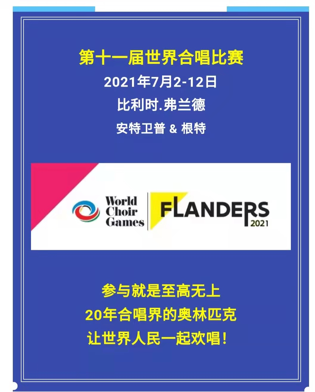 本届合唱比赛被称为合唱届的奥林匹克,已经成功地走过了20年的历程。在2021年,世界合唱比赛坚持的信念不变:“参与就是至高无上”和“让世界人民一起欢唱”的精神理念,将全球热爱合唱音乐的朋友们团结起来,相聚在世界合唱比赛当中,以和平竞技、切磋交流的方式将奥林匹克精神传遍世界各地。