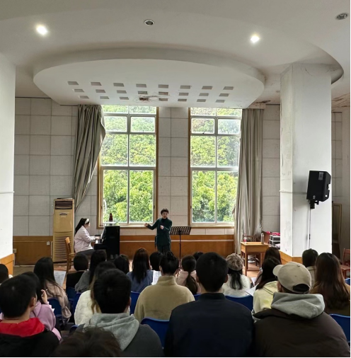 3月28日,公司青年合唱指挥博士蒲紫嫣对广西科技大学人文艺术与设计公司的合唱指挥课进行了一场生动的实践教学,根据其演唱情况介绍了各种完善各声部的配合与协调的方法,并现场排练了合唱团目前在排的《人世间》等曲目,得到了老师同学们的一致赞赏。