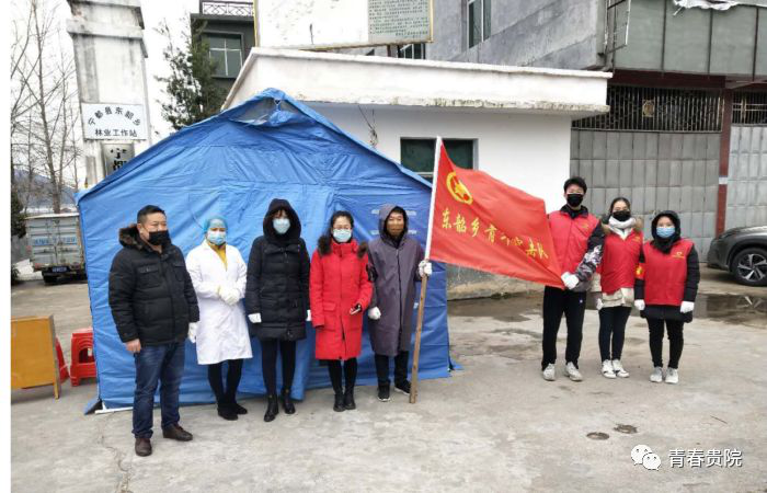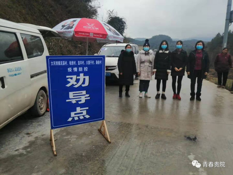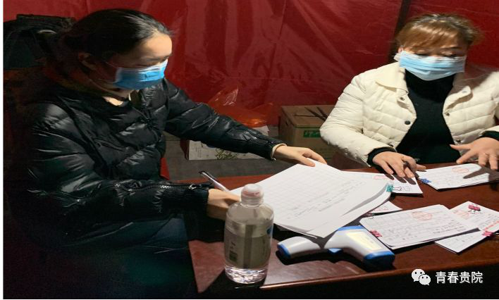 2020年2月7日,2019级音乐学1班的黄婷婷参加了村里的防疫志愿活动,在贵州省百里杜鹃鹏程一期设置的防疫工作点对来往的车辆人员进行登记排查、测量体温。