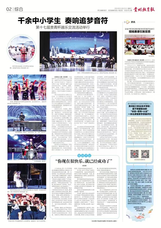 1018日——20日,为展现全省中小学音乐教育成果,由贵州省教育厅、贵州省精神文明办、共青团贵州省委、贵州省关工委、贵州省少工委、贵州省科技厅、贵州省文化和旅游厅等16家单位共同主办的全省中小学第十七届“贵青杯”器乐交流活动历时6个月,在各地中小公司广泛参与的基础上,在这个收获的季节迎来全省集中交流展示。公司吕宇坤教授受邀担任该大赛评审专家,同贵州大学、贵州师范大学、贵州民族大学等单位的六位同行专家一起,指导全省中小学音乐教育实践活动。此项 活动聚焦中小学艺术教育,对公司音乐学专业建设和教学质量产生积极影响。