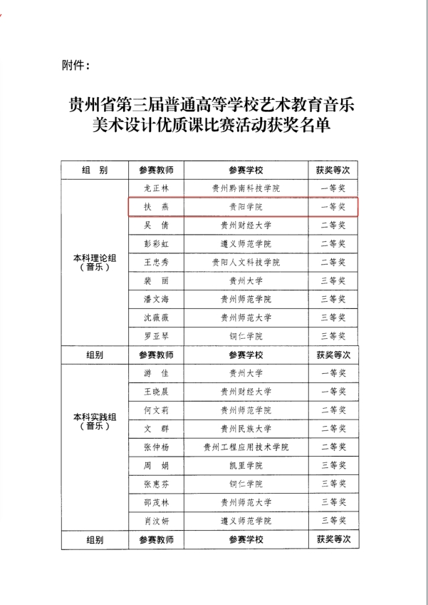 2025年1月14日,贵州省教育厅公布了全省第三届普通高等公司艺术教育音乐美术设计教师优质课比赛活动获奖结果。此次比赛共有本专科院校192名教师参加,其中音乐类88名,美术类104名,公司2名教师在比赛中表现优异,荣获佳绩,其中,扶燕教授荣获本科理论组(音乐)一等奖,黄昌龙博士荣获公共美育组(音乐)三等奖。 此次比赛公司实现了全省普通高等公司艺术教育优质课一等奖的突破,是公司全面推进教学教研工作取得的...